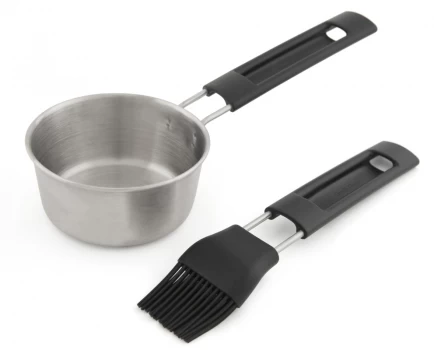 Dieses Set besteht aus einem Silikonpinsel und einem Edelstahlmarinadentopf mit integrierter Messeinheit, für das exakte Mischverhältnis Ihrer Lieblingsmarinaden.