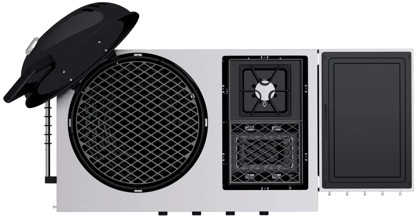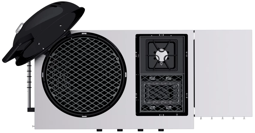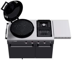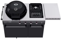 Volle Power für Kurzgebratenes gibt es nebenan auf dem Steakhouse Burner. Mit direkter Hitze von unten und hohen Temperaturen gelingen perfekt gebrandete Steaks. Auf dem Steakhouse Burner erhält man rasch eine schöne Kruste mit intensiven Röstaromen aufs Fleisch, bevor dieses in der Kugel schonend zu Ende gegrillt werden kann. Ergänzt wird diese einzigartige Outdoorküche durch eine zusätzliche Seitenkochstelle, auf welcher knackige Gemüsebeilagen, Röstzwiebeln für die Burger oder feine Saucen für den Braten zubereitet werden können. Ein ausgeklügeltes Stauraum-Konzept mit Soft-Closing Türsystem und viel Stauraum sowie das SAFETY LIGHT SYSTEM runden das Gesamtpaket perfekt ab.