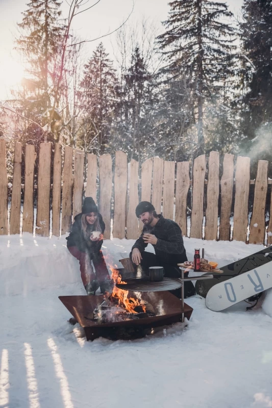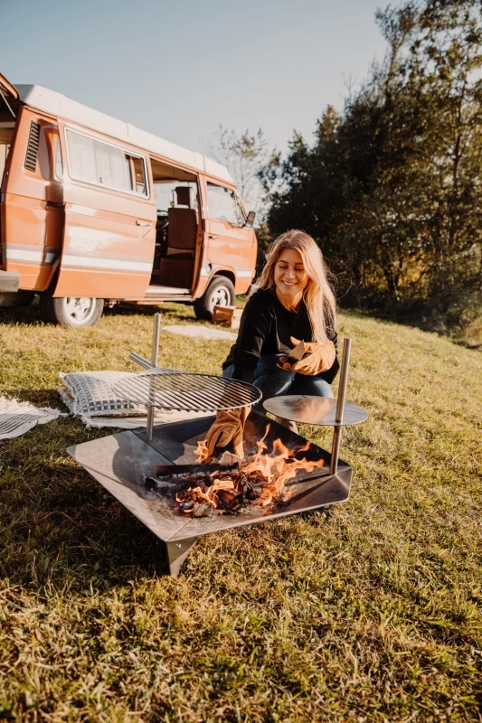 Als Ablagefläche für Glühwein, eine Kanne Tee oder das Grillgut ist der Tisch zum TRIPLE praktisch unverzichtbar. Wenn der Tisch nach innen geschwenkt wird, dient er sogar als Herdplatte für einen leckeren Eintopf oder ein feines Risotto.