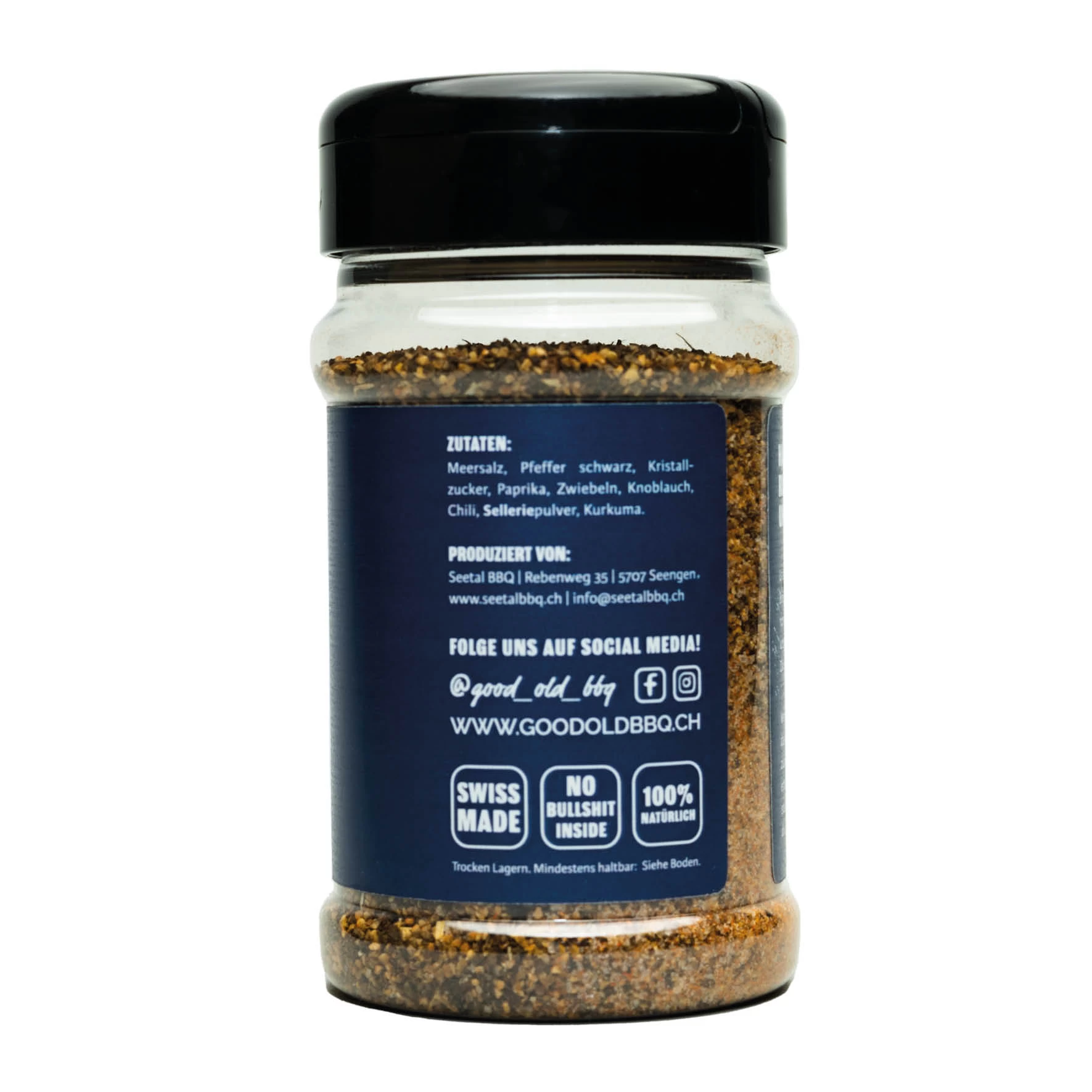 Meersalz, Pfeffer schwarz, Kristallzucker, Paprika, Zwiebeln, Knoblauch, Chili, Selleriepulver, Kurkuma.