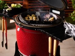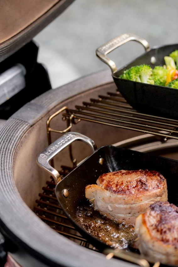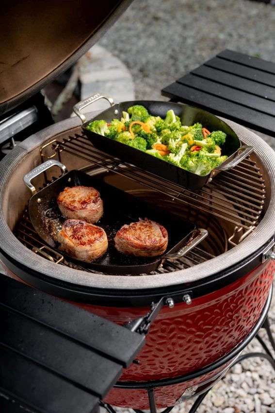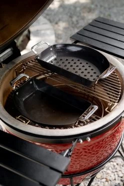 • Enthält eine perforierte Pfanne für direkten Flammenkontakt und eine massive Pfanne zum Braten und Grillen (oder Backen)