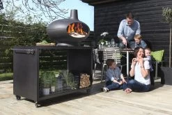 Morsø Forno Garden besteht aus dem Grill- und Pizzaofen und einem grossen Gartentisch (120 x 80 cm). Der geräumige Tisch ist mit Rollen ausgestattet, so lässt er sich leicht verschieben. Im Abteil unter dem Tisch können Sie das Brennholz dekorativ aufbewahren – und haben es immer schnell zur Hand.