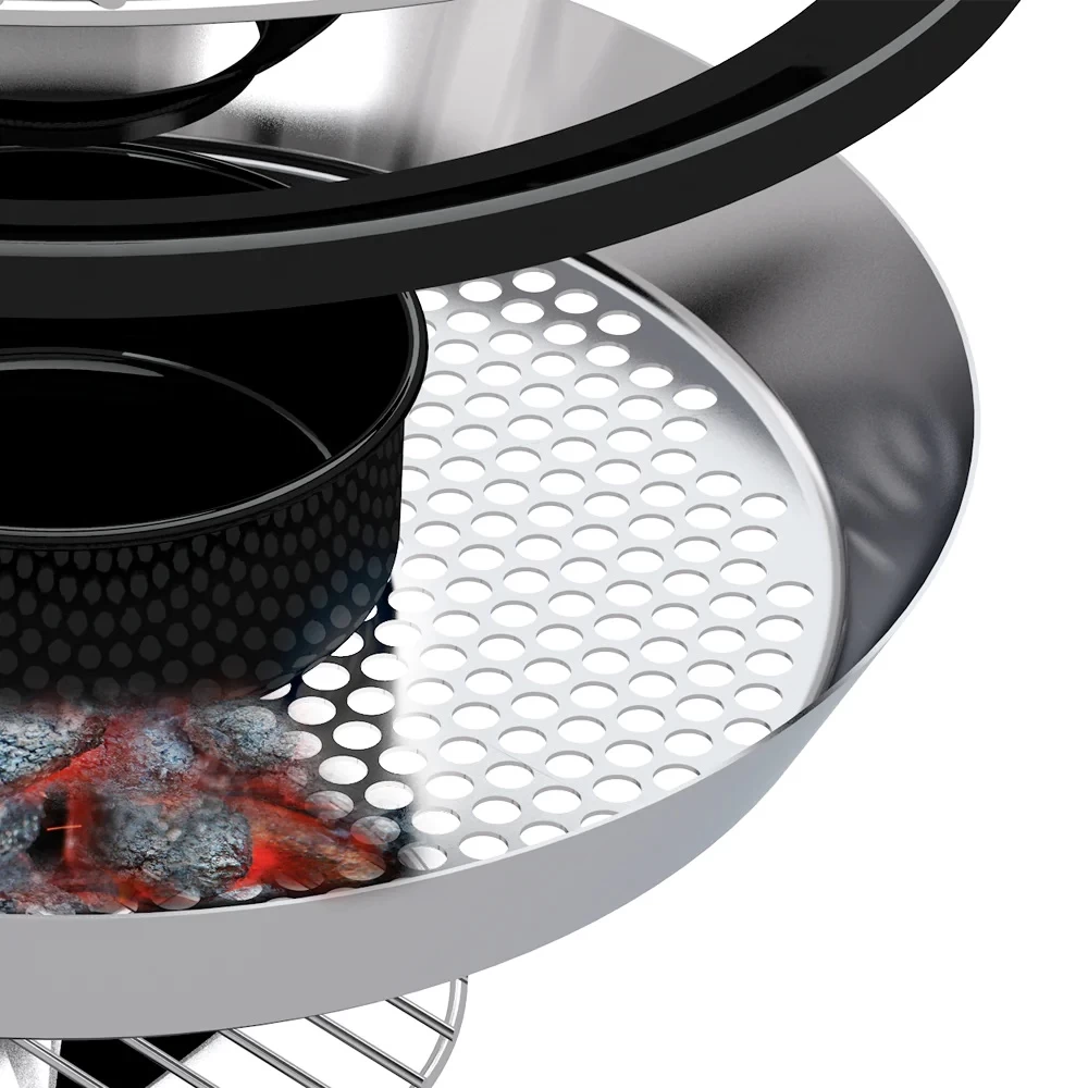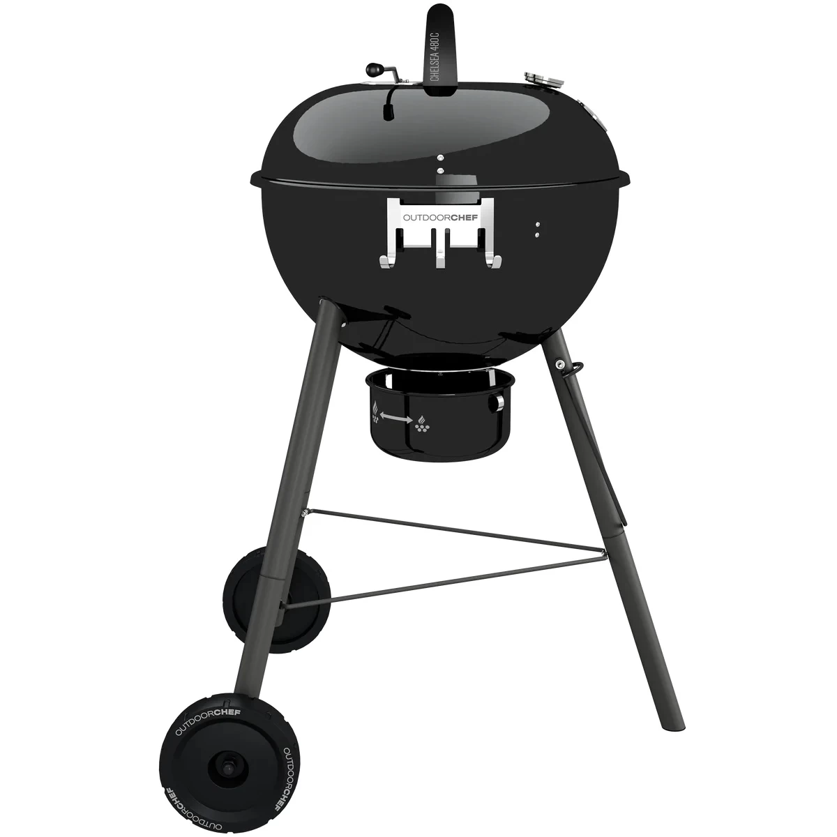 Der Chelsea 480 C weist das einzigartige SLIDE Trichtersystem auf. Dank diesem System kann bis zu 100% der Grillfläche indirekt genutzt werden. Der Edelstahl-Kohlebehälter ermöglicht schnelles Anfeuern und geringen Kohle-/Brikettverlust während des Grillens. Die Hitzesteuerung erfolgt über die beiden Ventilationen oben und unten. Das integrierte Deckelscharnier bietet optimalen Komfort und die Bodenablage Platz für Zubehör.