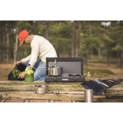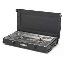 Each burner of the Primus Kinjia stove can be fired up and run independently, allowing outdoor chefs to cook multiple pots at a wide range of temperatures, keeping sauces slowly simmering and the water at a rolling boil from the 10,200BTU (3000W) flame. The sleek die-cast aluminum and stainless steel body will hold up to years of use. The stainless steel internal pot supports and drip tray are removable for easy cleaning. When storing, simply lock closed as this slim-profile stove can be stashed almost anywhere.
