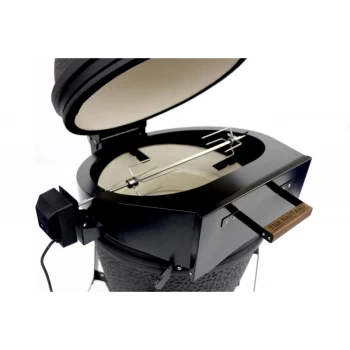 Zur Verwendung als Rotisserie und Pizzaofen. Die praktische Tür an der Vorderseite hält die Kuppel geschlossen, damit du das Feuer schüren und die Hitze behalten kannst. Der Rotisserie-Ofen kommt mit einem dicken, massgeschneiderten Pizzastein. Damit ist es das ideale Pizza-Accessoire für deinen The Bastard. Der abnehmbare Drehspiess hat einen starken Motor und grosse Krallen.