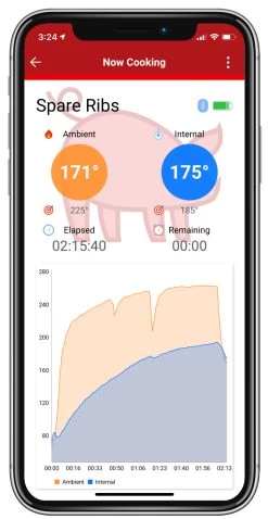 Thermometer ins Fleisch stecken, App starten und los geht’s mit bis zu 8 Thermometern gleichzeitig in einer App mit beliebig vielen Endgeräten, die Zugriff haben. Dank dem neu integrierten Blutetooth XTender hat der MeatStick Cyber X eine Reichweite von bis zu 80m.