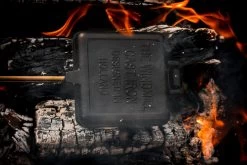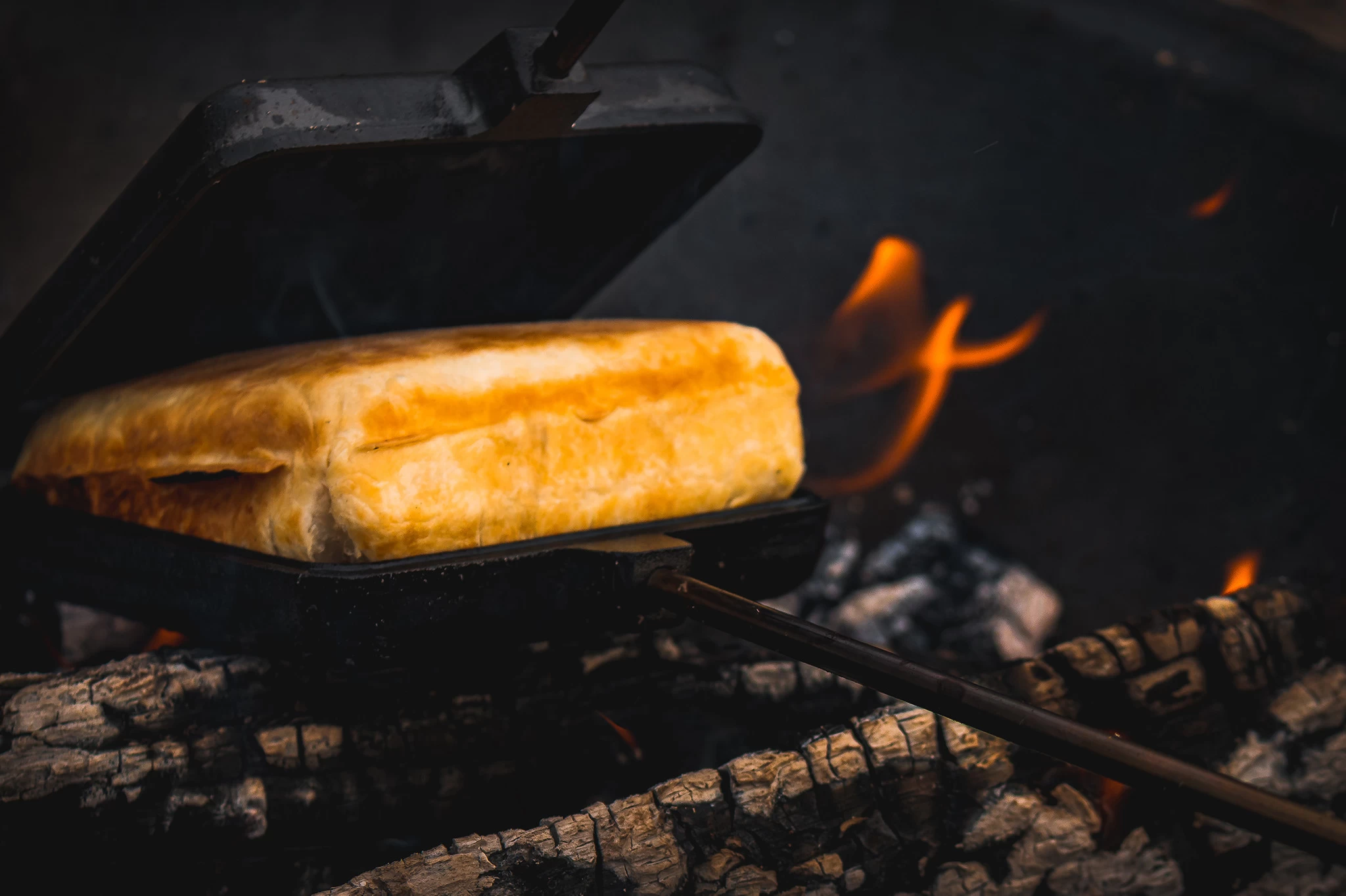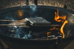 Dieses Grilleisen wurde speziell zur Zubereitung von Grillsandwichs über dem Lagerfeuer entworfen. Es hat Holzgriffe an Stielen aus Edelstahl, die mit einem Gewinde festgeschraubt und wieder entfernt werden können.