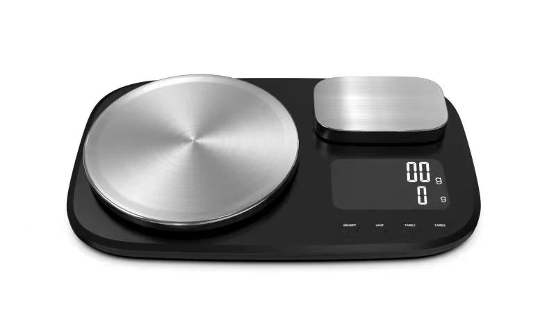 Dank der zwei Plattformen können unterschiedliche Zutaten abgwogen werden. Die kleinere Waage rechts misst mit 0.1g extakt beispielsweise Hefe ab. Auf der grossen Waage können Mehl, Wasser, Zucker etc. aufs Gramm genau abgewogen werden.