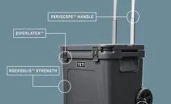 Die Roadie® 48-Kühlbox auf Rädern wurde für das Mitnehmen von Speisen und die Versorgung größerer Gruppen entwickelt. Sie verfügt über die gleiche Isolierleistung, die man auch von einer Tundra®-Kühlbox erwarten würde. Sie ist außerdem genauso widerstandsfähig – vom Griff bis zu den robusten Rädern ist dieses Material praktisch unzerstörbar.